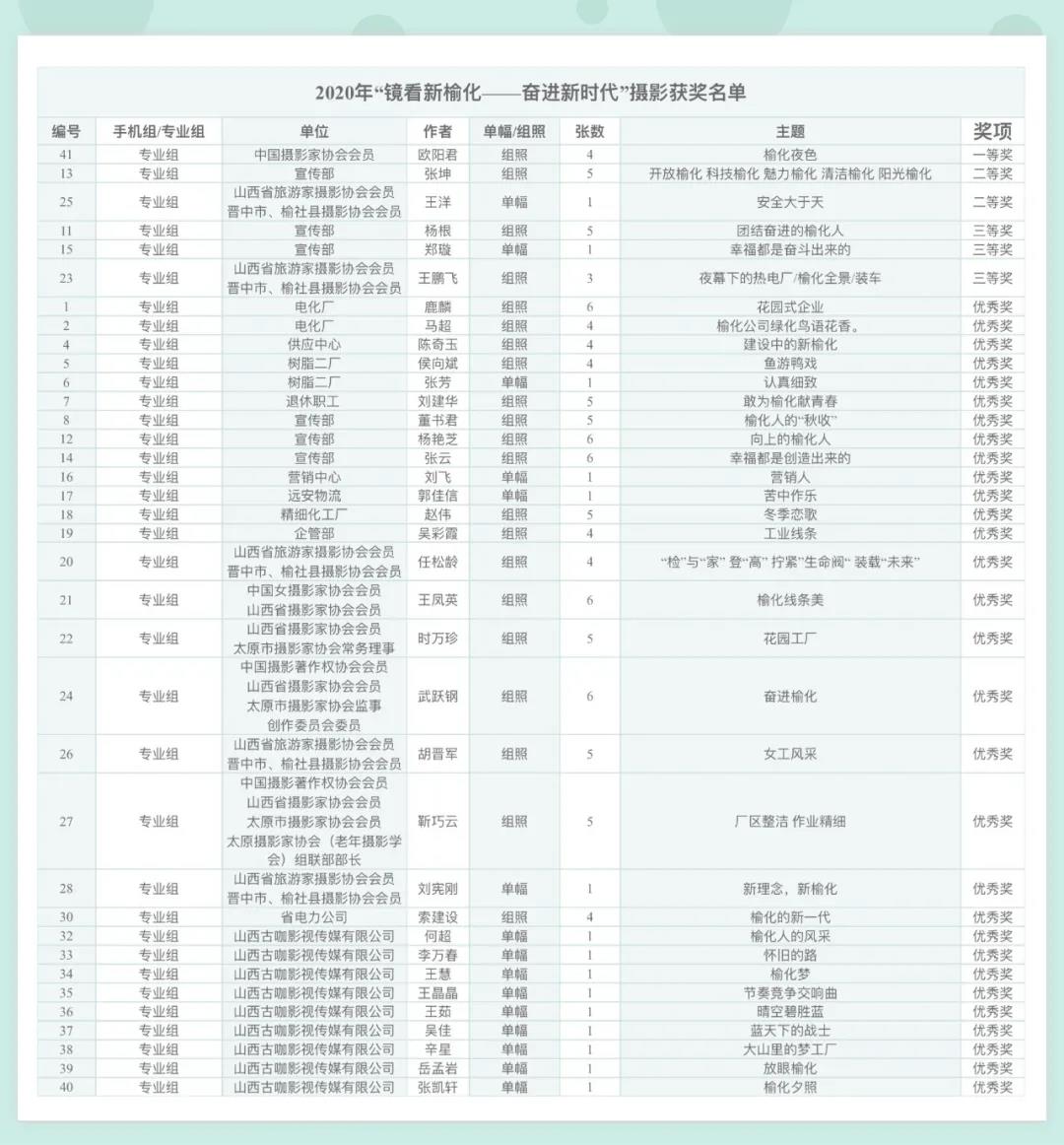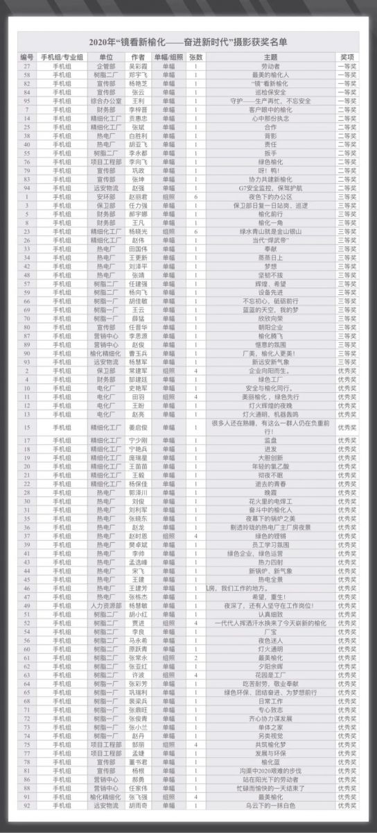 榆化公司2020年“鏡看新榆化——奮進新時代”攝影大賽評選結果公布如下: