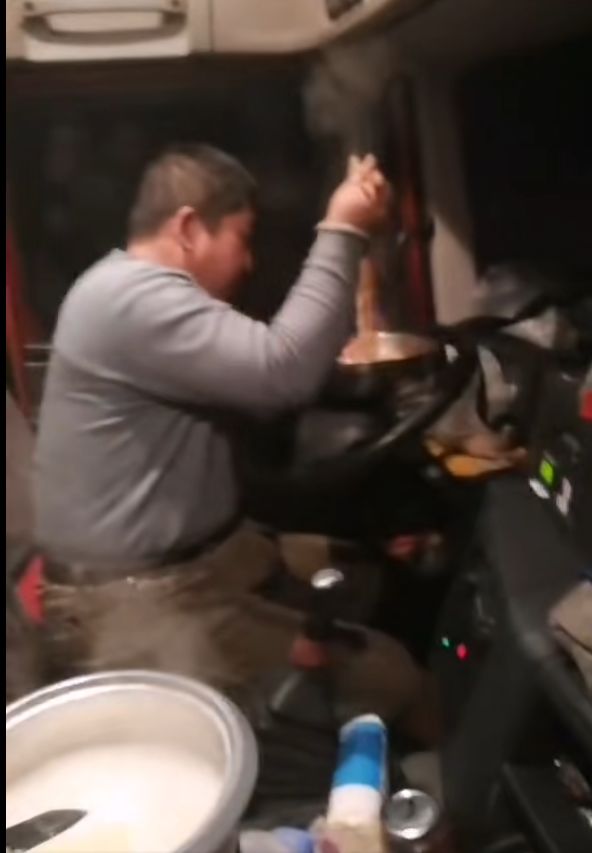 (司機師傅在服務區吃著熱騰騰的泡面)