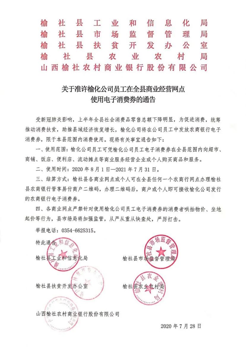 7月26日,榆化電子消費券率先通過52名在崗年薪制干部進行試用;8月18日,榆化電子消費券正式進入榆社市場。