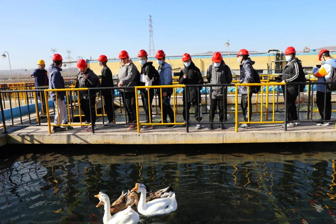在污水處理車間,大家被污水池魚游鴨戲的場景深深吸引,紛紛舉起手機拍照留影。