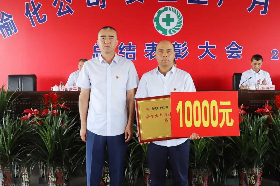 副總經理常曉飛為獲得“安全生產月”活動綜合排名第三名的電化廠20萬噸頒獎