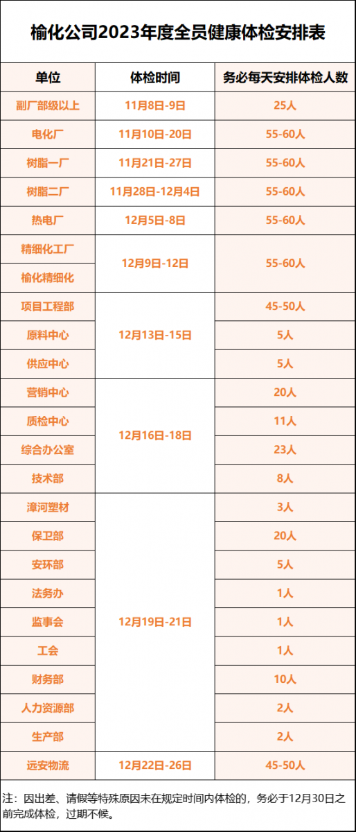根據(jù)《榆化公司全員健康體檢實(shí)施方案(試行)》的文件精神,公司定于11月8日起組織開展全員健康體檢。具體事宜安排如下: