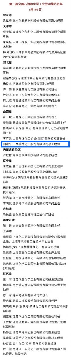 1月15日,第三屆全國石油和化學工業先進集體、勞動模范和先進工作者表彰大會采用線上線下相結合的方式在京召開。會上,人力資源和社會保障部、中國石油和化學工業聯合會表彰了81個單位“全國石油和化學工業先進集體”、105名“全國石油和化學工業勞動模范”、10名“全國石油和化學工業先進工作者”。公司總工程師田建平被授予“全國石油和化學工業勞動模范”稱號,享受省部級勞模待遇。