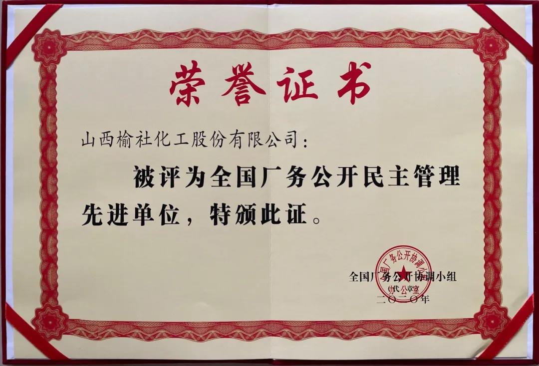 山西榆社化工股份有限公司通過開展企務公開、民主管理工作,促進企業(yè)廉政建設,榮獲“全國廠務公開民主管理先進單位”榮譽稱號。