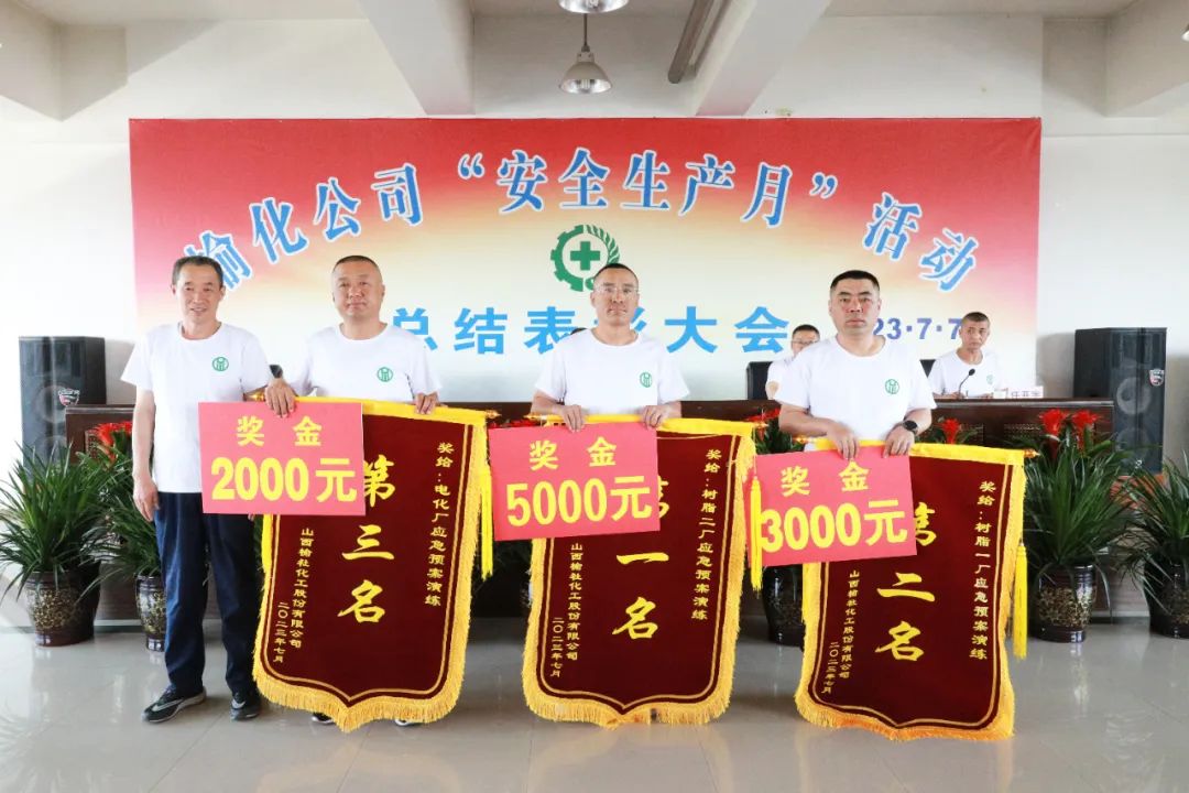 田建平為獲得“安全生產(chǎn)月”活動(dòng)應(yīng)急預(yù)案演練獎(jiǎng)的樹脂二廠、樹脂一廠、電化廠頒獎(jiǎng)
