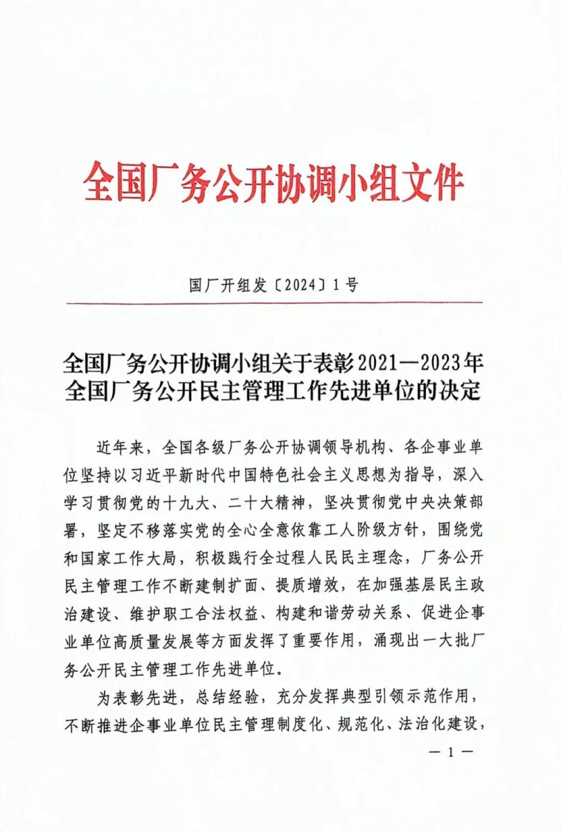 近日,全國廠務(wù)公開協(xié)調(diào)小組下發(fā)了《關(guān)于表彰2021—2023年全國廠務(wù)公開民主管理工作先進單位的決定》,我公司榮獲“2021—2023年全國廠務(wù)公開民主管理示范單位”稱號。自2023年11月,經(jīng)過縣、市、省逐級申報、層層篩選,最終被全國廠務(wù)公開協(xié)調(diào)小組評為全國廠務(wù)公開民主管理示范單位。