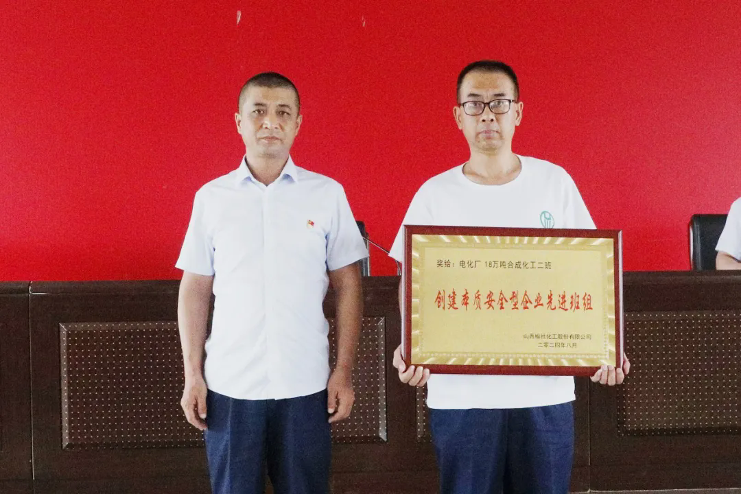 會議對在第一階段創建本質安全型企業中取得突出成績的先進班組“電化廠18萬噸合成化工二班”進行了表彰,任開宇為其頒發榮譽獎牌。班組負責人馬益波進行了經驗交流分享。