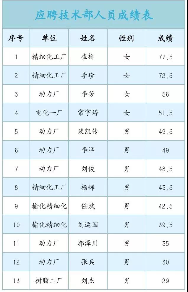 根據筆試成績,結合部門意見,本著寧缺勿濫的原則,擇優前兩名(精細化工廠:崔柳77.5分,李珍72.5分)為技術部科員。(鄭璇)